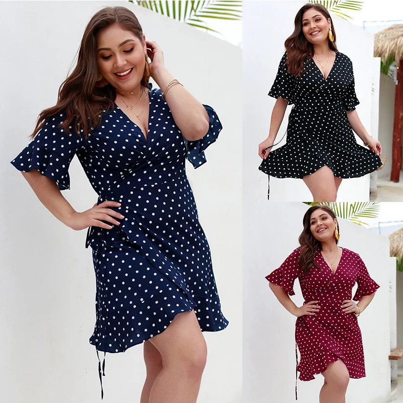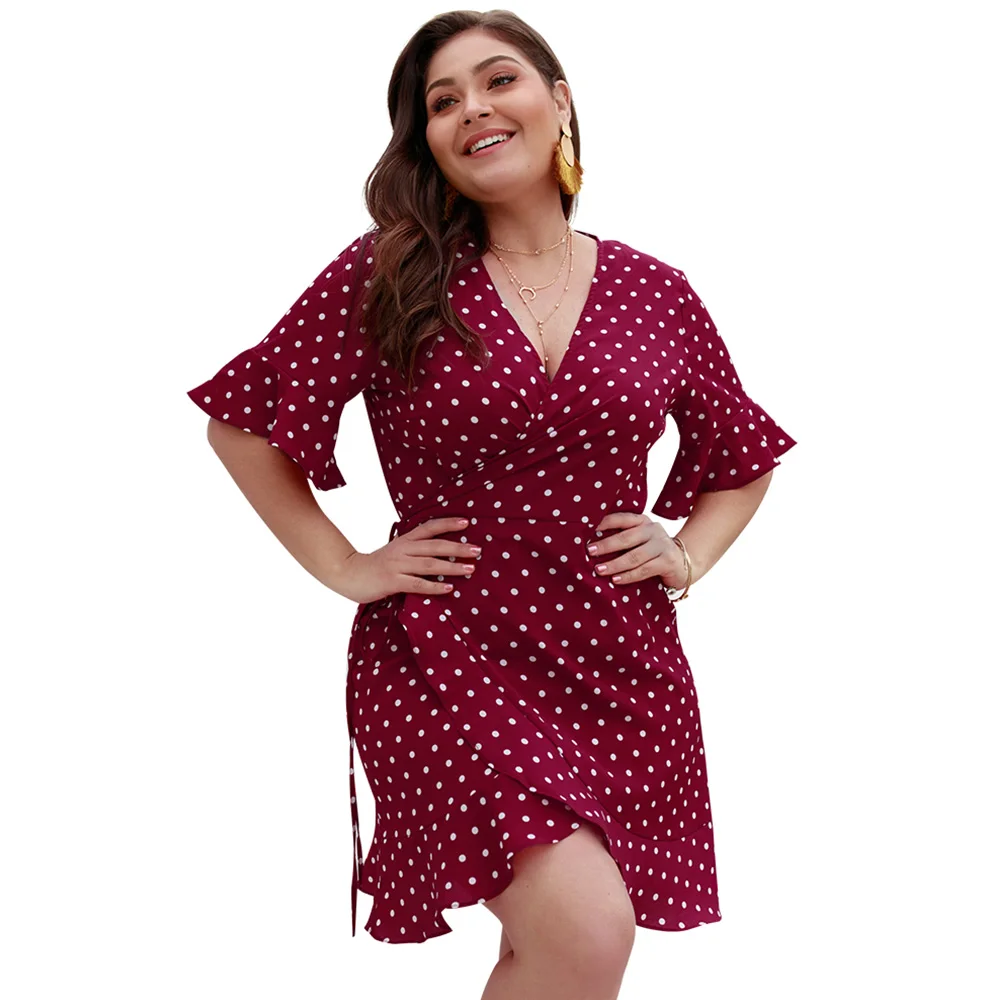 Images of Polka Dot Print Wrap Dress Women Spring Summer Butterfly Short Sleeve V-Neck Sexy Dress Ladies Lace Up Plus Size Dresses :