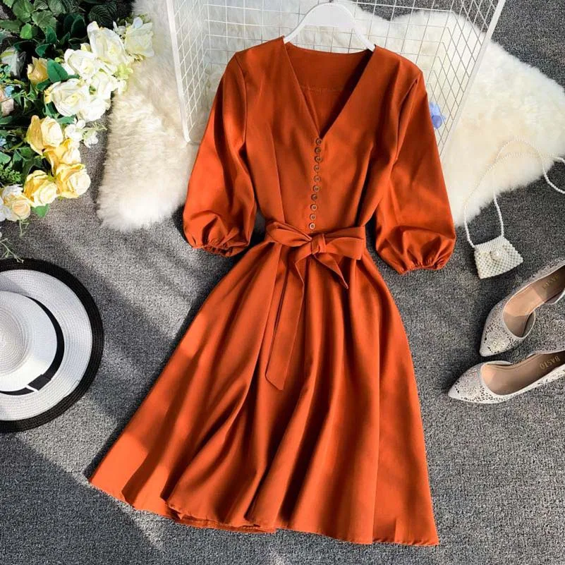 Get this Elegant Women Summer V-neck Lantern Sleeve Bandage Strap Sashes Button Dress New Vintage A-line Slim High Waist Party Midi Dress with limited time discount by pressing the button below