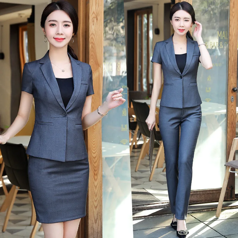 Images of Short Sleeve Formal Uniform Styles Blazers Suit 2 Pieces Tops and Skirt for Ladies Office Work Wear Business Blazer Sets Clothes :