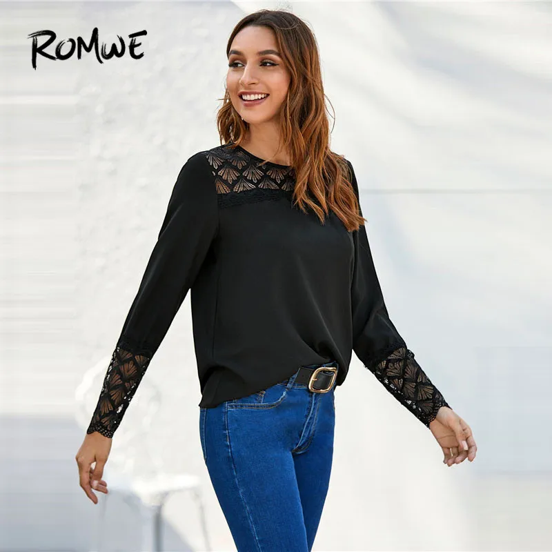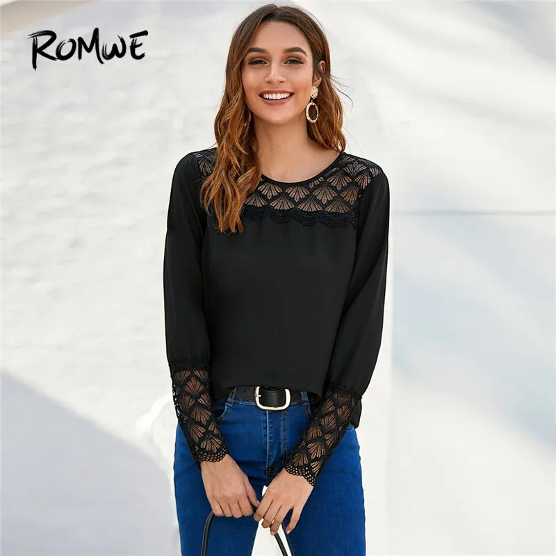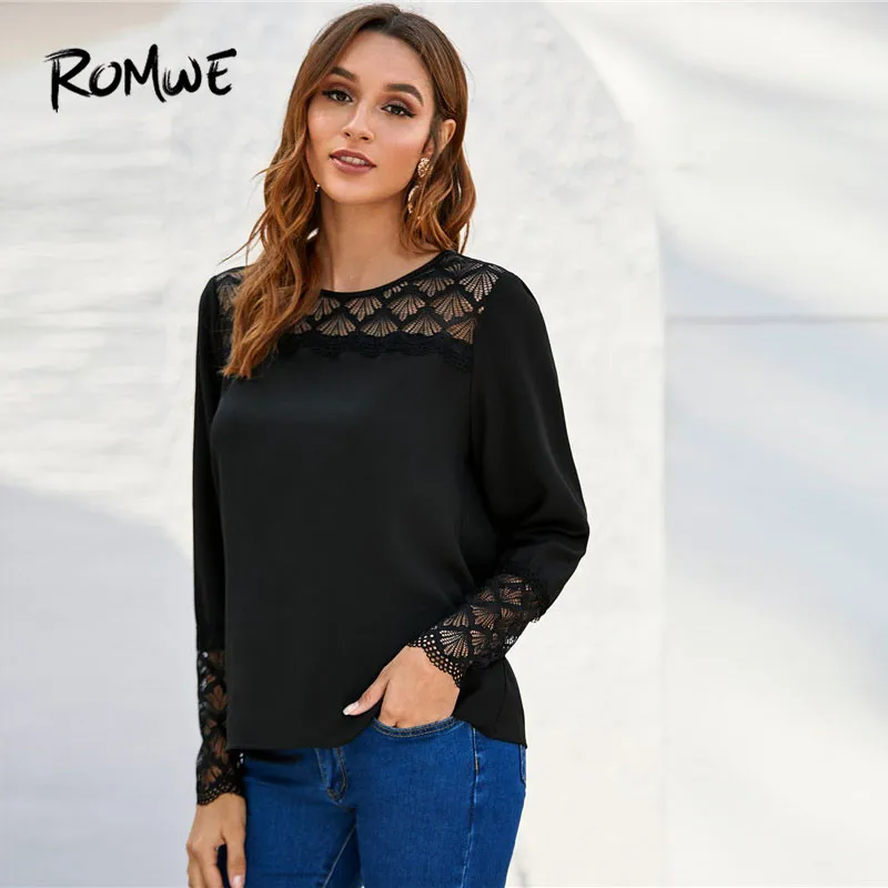 Buy ROMWE Lace Yoke And Cuff Ladies Tops 2020 Spring Long Sleeve Shirt Women Solid Lace Blouse Elegant Woman Clothes Top