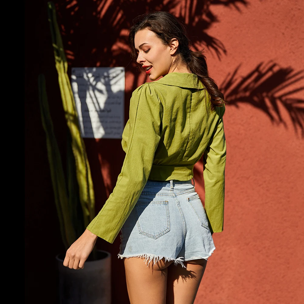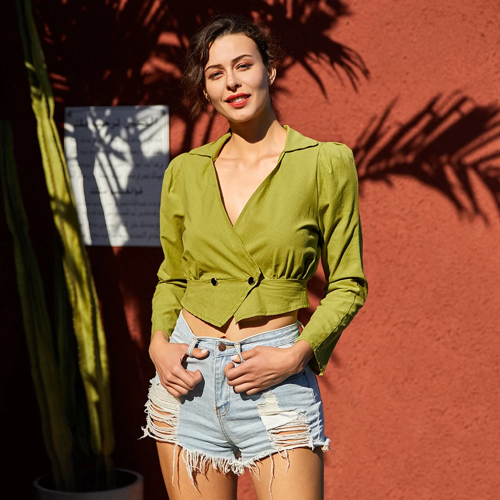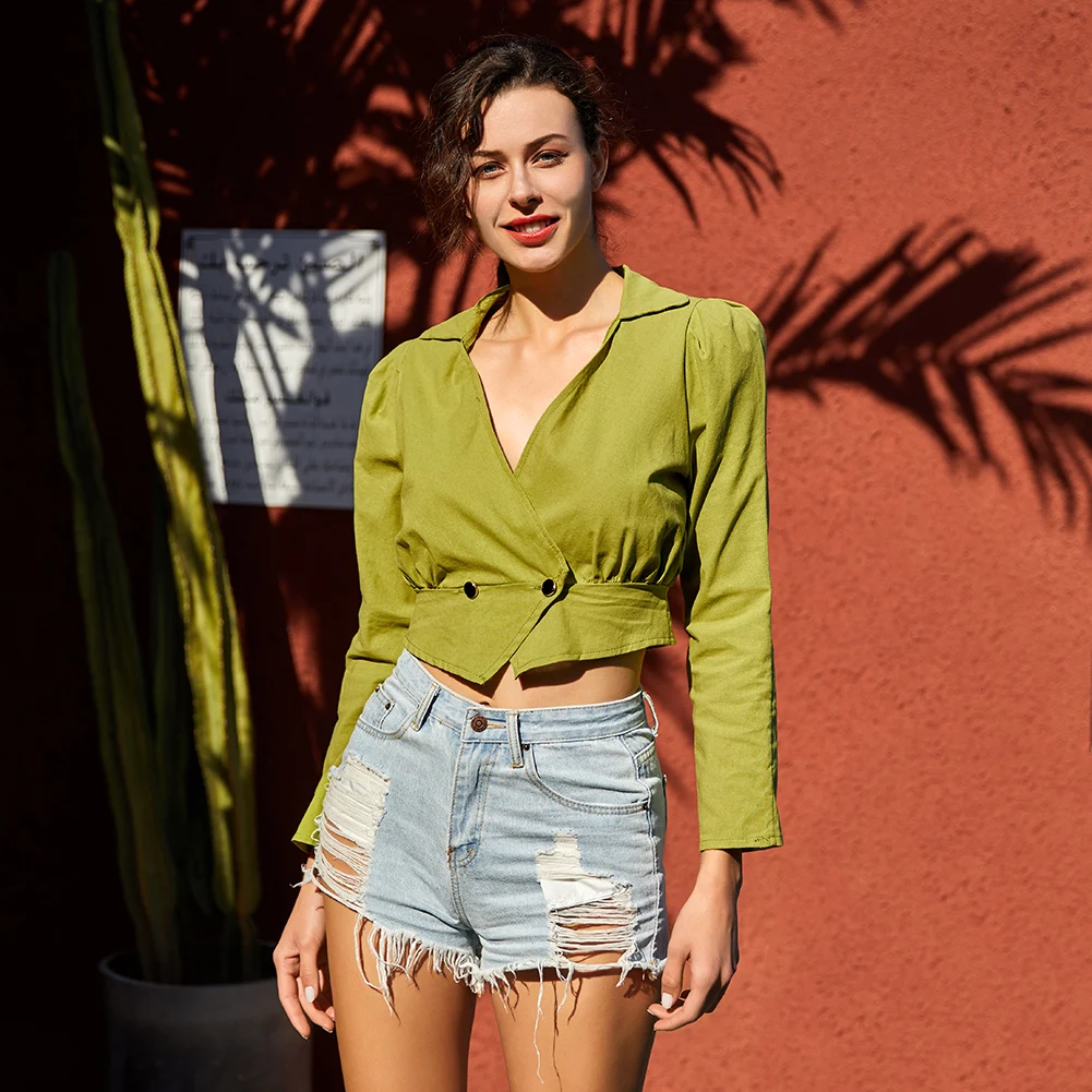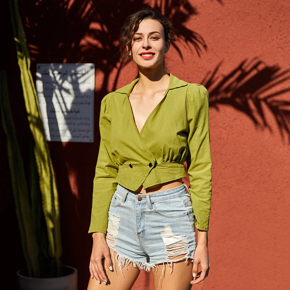 Promo Bohisen Women Blouses 2019 Fashion Long Sleeve Turn Down Collar Crop Female Blouse Casual Tops Green Blusas Femininas