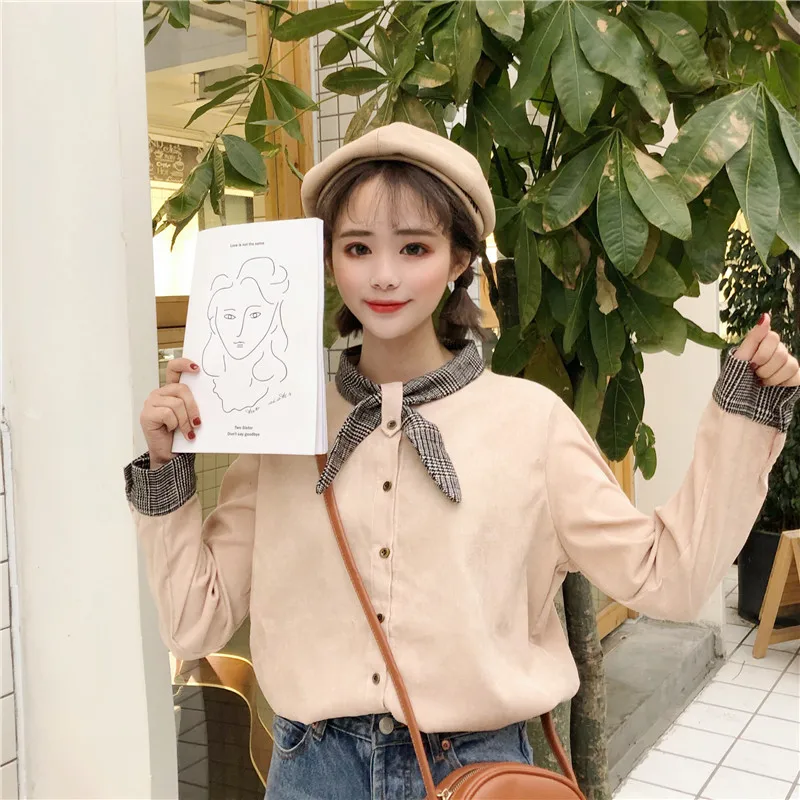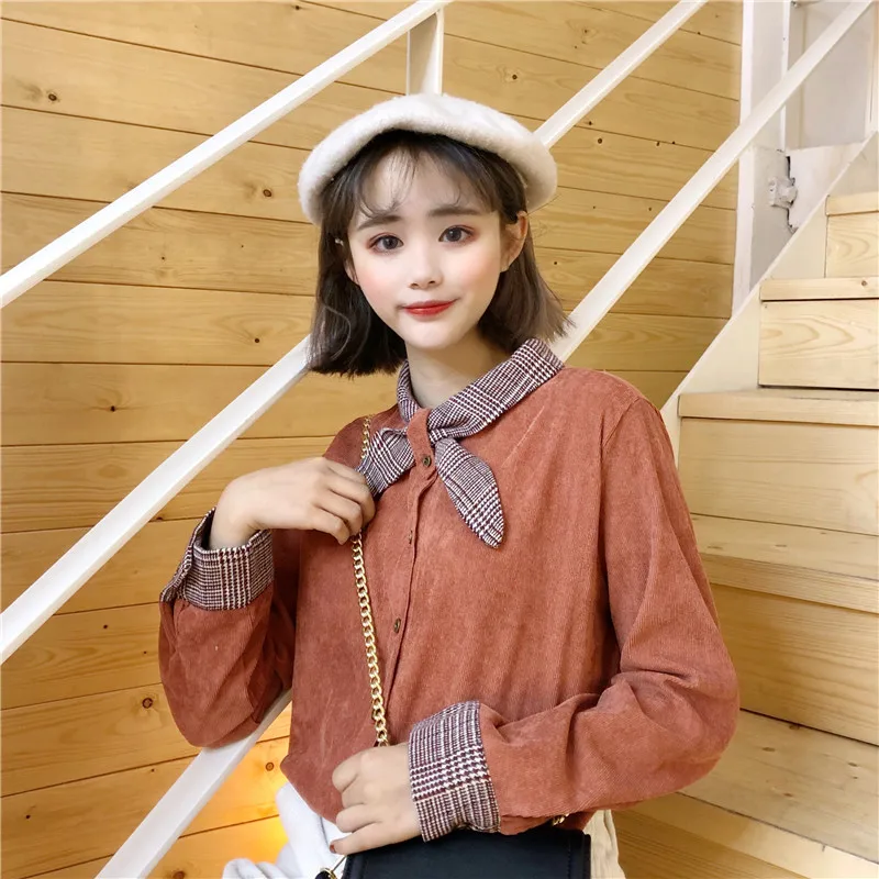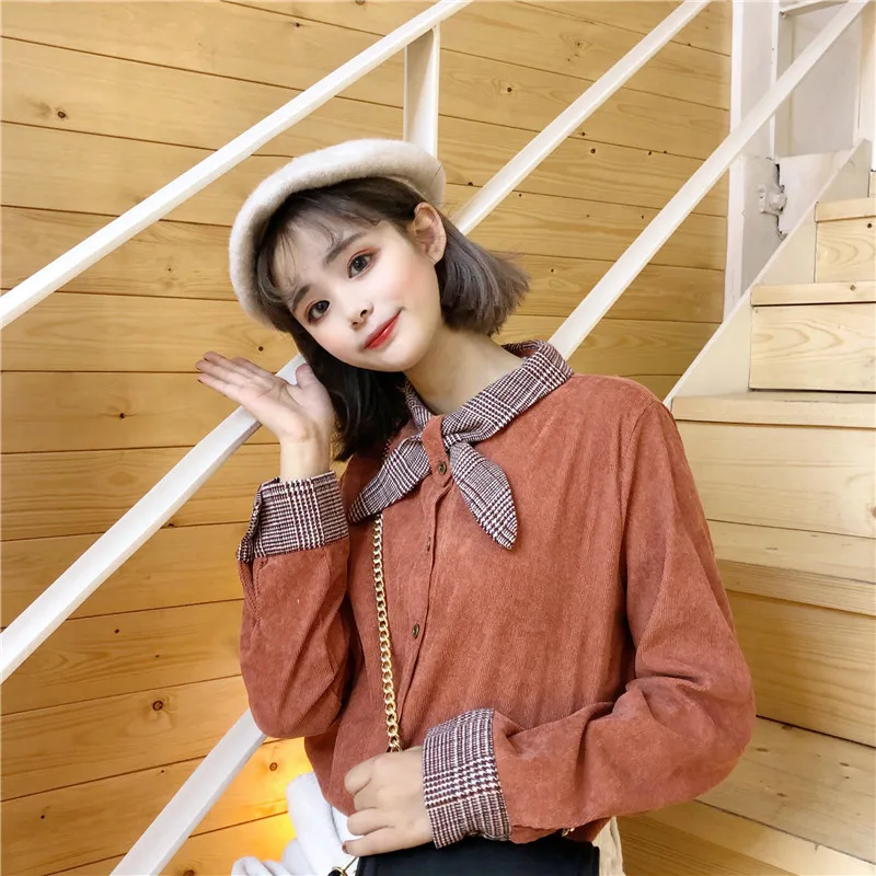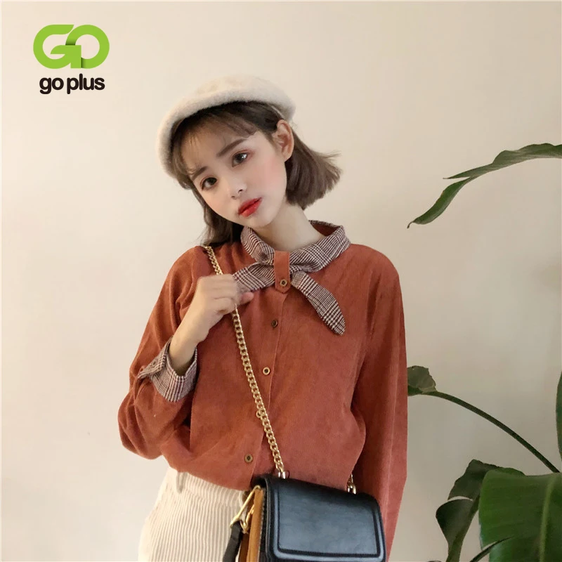 Images of GOPLUS Spring Women's Blouse Shirt Casual Corduroy Turn-down Collar Long Sleeve Bow Blusas Womens Tops and Blouses Ropa Mujer :