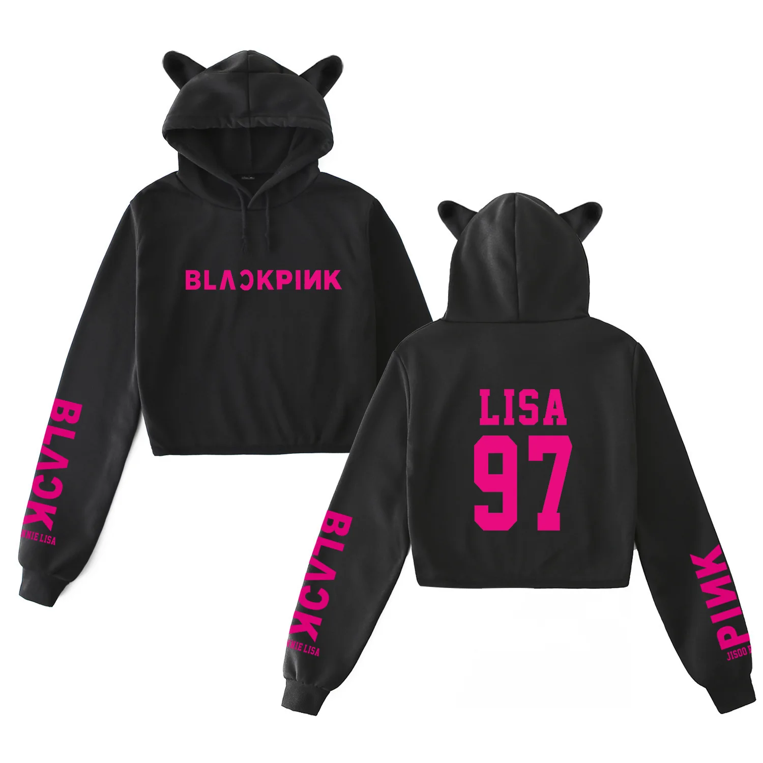 Sale 2020 Women Hoodie Blackpink Kpop Casual Print Navel Exposed Funny Cat Ear Cropped Short Sweatshirt Hooded Autumn Female Pullover