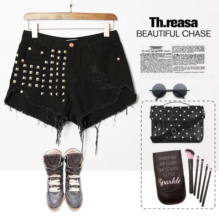 Get this Europe and The United States Explosion Models Hot Sale Hole Riveting Irregular Denim High Waist Pants Short with limited time discount by pressing the button below
