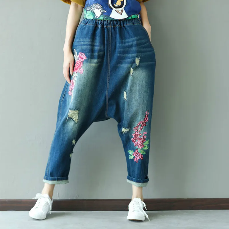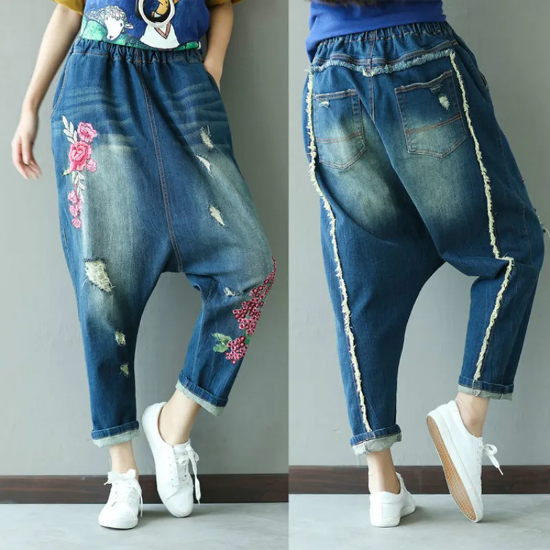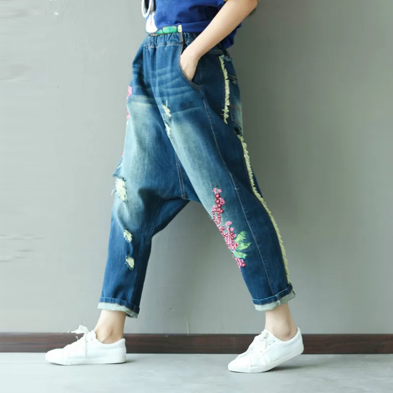Get this New arrival embroidery print big hole jeans female ankle length trousers casual pants harem pants with limited time discount by pressing the button below
